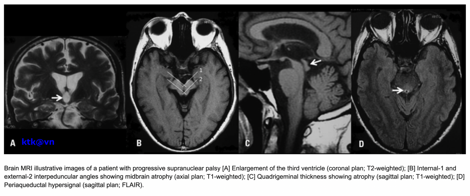 – Đo lường chiều rộng trước sau và thể tích của cuống não của bệnh nhân PRP-RS nhỏ hơn bệnh nhân teo đa hệ thống và bệnh Parkinson. Liệt trên nhân tiến triển có giảm diện tích não giữa trên mặt phẳng đứng dọc giữa, giảm tỷ lệ cuống não/cầu não. Tuy nhiên độ nhạy và độ đặc hiệu của tỷ lệ cuống não/cầu não phân biệt PSP-RS và teo đa hệ thống thể Parkinson (MSA-P) còn dao động khác nhau giữa các nghiên cứu.